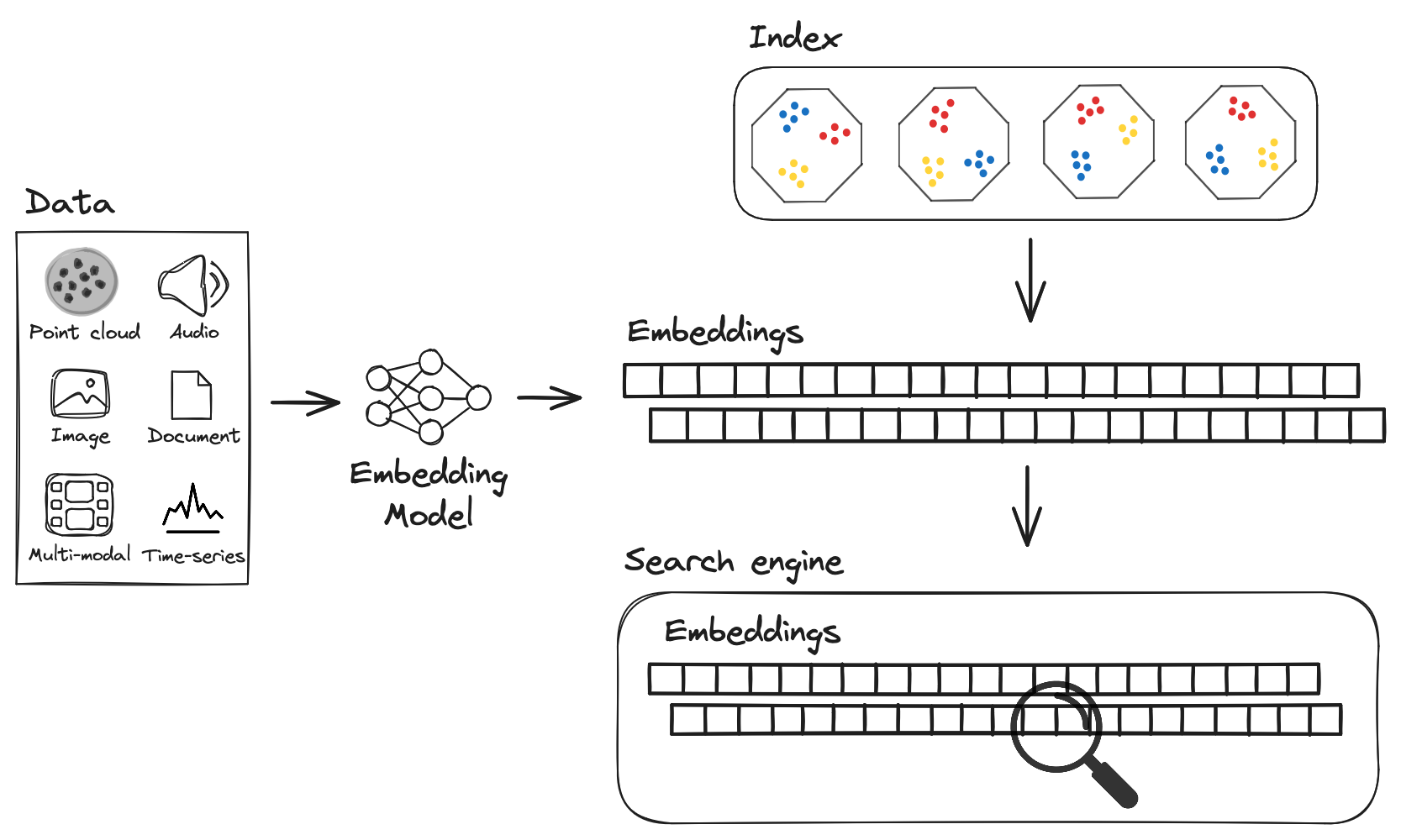 The simplest way to perform vector search is to perform a brute force search, without an index, where the distance between the query vector and all the vectors in the database are computed, with the top-k closest vectors returned. This is equivalent to a k-nearest neighbours (kNN) search in vector space. Choose brute force search when you need guaranteed 100% recall, typically with smaller datasets where query speed isn’t the primary concern. The system scans every vector in the table and calculates precise distances to find the exact nearest neighbors.